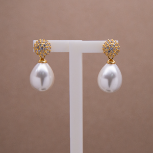 Arete de aleación con baño de oro y madre perla en forma de gota con pavé de circones broche de poste