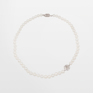 Feminidad pura con una elegancia contemporánea, es como definimos éste collar corto de perlas cultivadas y detalle de flor de rodio. Un delicado y atractivo collar para quien es femenina y sofisticada.