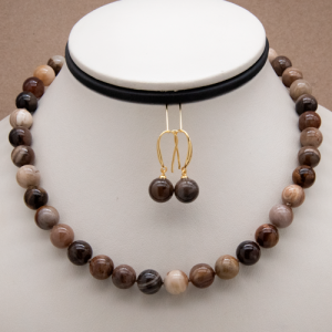 Collar corto con aretes de piedra Wood Agate y broche de chapa de oro de 18k