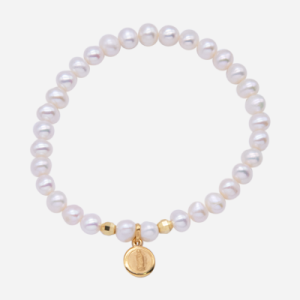 Pulsera de perlas cultivadas de 6mm con escapulario de oro laminado Virgen de Guadalupe / Sagrado Corazón y dos beads