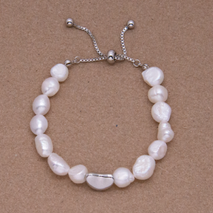 Pulsera ajustable de rodio con perlas irregulares y dije de rodio